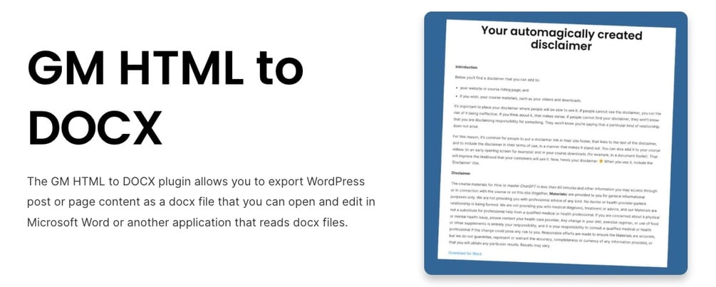 The GM HTML to DOCX plugin allows you to export WordPress post or page content as a docx file that you can open and edit in Microsoft Word or another application that reads docx files. If you're using Gravity Forms as well as the Gravity Wiz perk called "Gravity Forms Post Content Merge Tags" (purchased separately), you can use the GM HTML to DOCX plugin to download the content of a page that a user is taken to on form submission. That page could be a page with static content or, more significantly, it could be a page that is customised by reference to the user's form inputs (using standard Gravity Forms merge tags and, if you want to include content conditionally, Gravity Form's conditional shortcodes). This makes the plugin extremely useful for those who wish to automate document creation and, because the styles have been set by a lawyer who drafts contracts, it's perfect for contract automation.